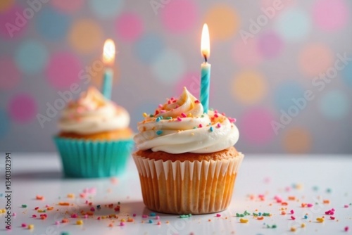 Colorful birthday cupcake on white table with candles lit, celebration, cupcake, birthday
