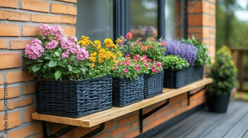 Colorful blooming flowers in black wicker baskets on wooden shelf, gardening decoration, spring home outdoor patio, natural vibrant plants, brick wall background, cozy bright atmosphere