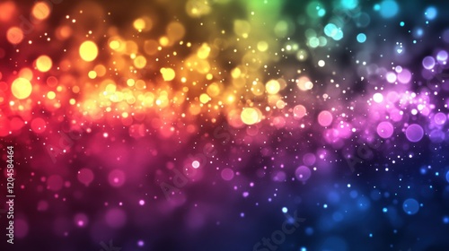 Colorful bokeh lights background with rainbow hues and sparkles.
