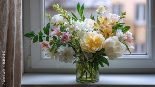 flower, bouquet, vase, glasses, indoor, window, colourful, flower petals, greenery, floral, blooming, spring, decor, arrangement, home, natural, light, peony, lily, pink, white, yellow, freshness, beauty, fragrant, soft, bright, cheerful, peaceful, nature, aesthetic, interior, flower, decoration, flora, garden, seasonal, relaxation, elegance, harmony, stylish, tranquil, outside, modern, lovely, inviting, vibrant