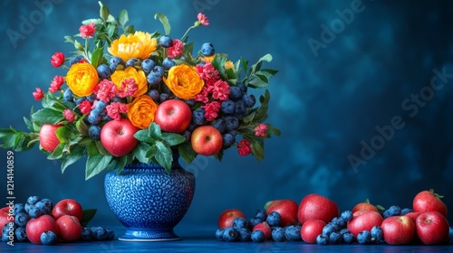 Colorful bouquet of fresh fruits in a blue ceramic bowl