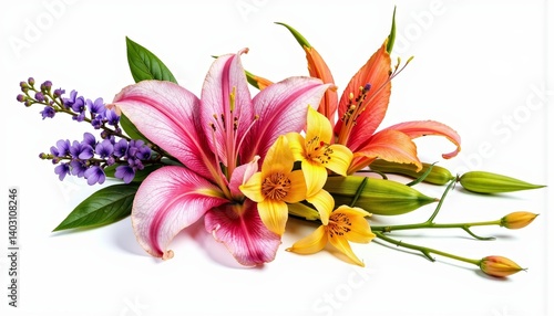 Colorful bouquet of lilies and roses against a white background