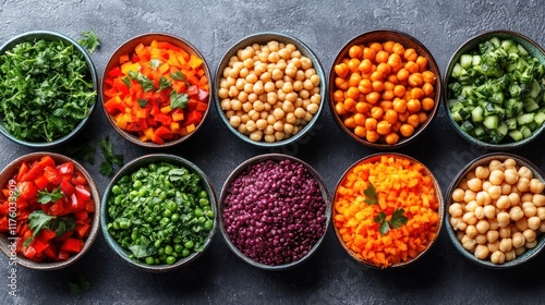 Colorful bowls of assorted vegetables and legumes arranged for a healthy meal preparation.