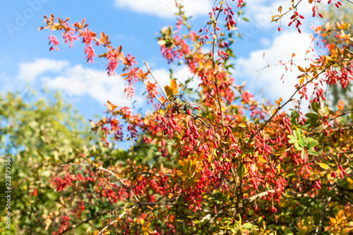 bush, plant, barberry, berberis, shrub, tree, ripe, red, seed, berry, fruit, colourful, forest, wood, nature, natural, scenic, view, green, yellow, leaf, garden, twig, tree branch, sunny, day, september, russia, russian, autumn, blue, sky, season