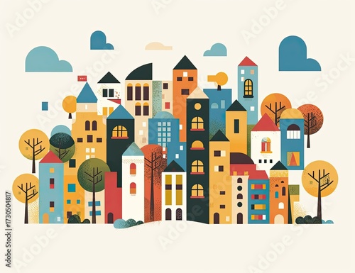 building, flat, city, illustration, tree, cloud, scape, colourful, architecture, design, urban, town, cartoon, abstract, skyline, style, geometric, modern, housing, structure, exterior, facades, residential, building, apartment, property, estate, home, district, habitat, dwelling, place, environment, scenic, panorama, view, community, neighbourhood, village, landscape, background, pattern, graphic, simple, minimalist, art, texture, decoration
