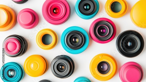 accessory, artistic, bright, colours, design, equipment, flat, isolated, lens, modern, photo, round, shape, style, top, unique, vibrant, view, visual, white, arrangement, creative, circle, detail, close, hobby, photo, product, collection, background, texture, object, colourful, playful, variety, fashionable, display, element, studio, composition, circular, item