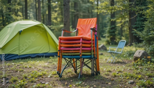 Colorful Camping Chairs Stacked Near Green Tent in Forest Setting