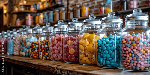 Colorful candies in glass jars.