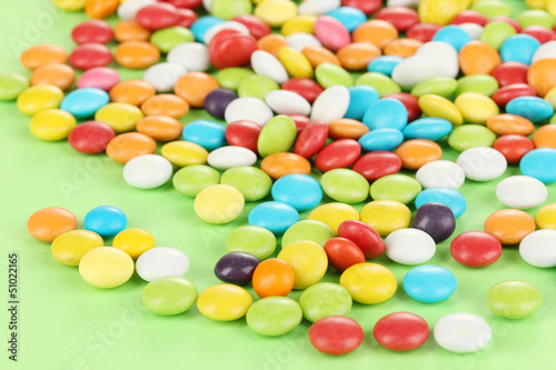 Colorful candies on green background