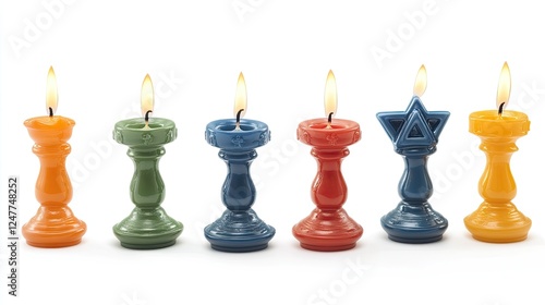 Colorful candlesticks with burning candles arranged in a row on white background.