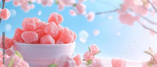 Colorful candy in a bowl surrounded by cherry blossoms, bright background.