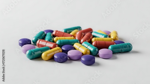 colorful capsules and tablets scattered on a clean white background, sharp studio lighting, minimal pharmaceutical concept created with generative ai