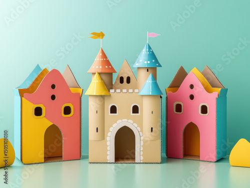 Colorful cardboard castles with whimsical designs stand against pastel green background, showcasing creativity and playfulness. structures feature vibrant hues and imaginative shapes