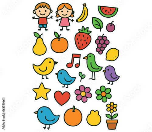 Colorful Cartoon Kids Icon Set – Fun Doodle Fruits, Birds and Characters Collection