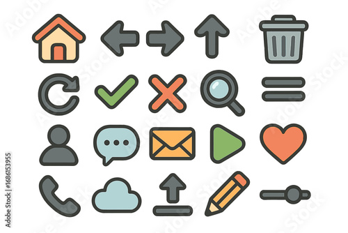 Colorful cartoon UI icon set for web and mobile app interface. Vector collection of simple navigation and communication symbols like home, search, message, and settings.