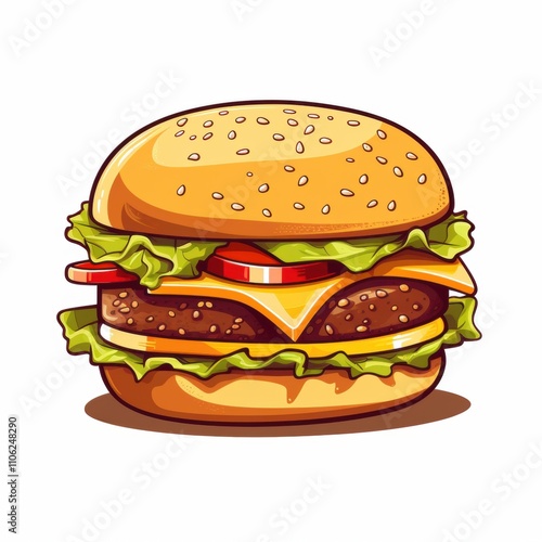 burger, cheeseburger, sandwich, beef, patty, lettuce, tomatoes, bun, fast food, snack, meal, cartoon, illustration, drawing, tasty, delicious, vibrant, white background, hamburger, food, cheese, bread, isolated, meat, fast, white, lunch, fat, sesame, onion, salad, dinner, unhealthy