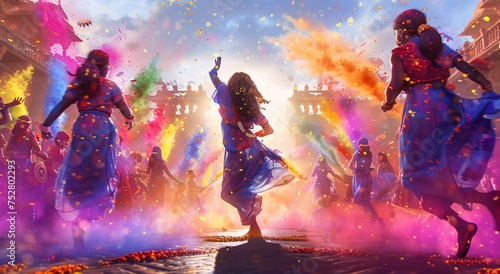 Colorful Celebration A Woman in a Blue Dress Dancing in a Colorful Painted World Generative AI