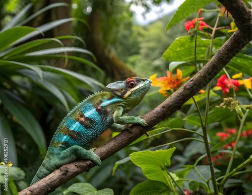 Colorful Chameleon Blending in on a Branch in Tropical Forest