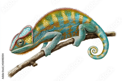 Colorful chameleon climbing along a branch in a vibrant forest setting during daylight hours, showcasing its unique skin patterns and textures Generative AI