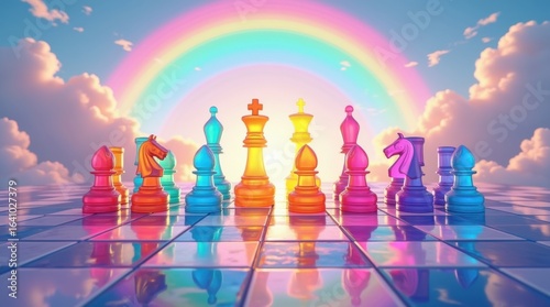 chess, rainbow, vibrant, artistic, fantasy, dreamy, strategy, imagination, fun, skill, competition, move, succeed, challenge, joy, vision, beautiful, colours, surreal, scene, knight, rook, queen, king, iconic, thought, mind, thinking, unique, polished, childhood, nostalgia, future, emotional, whimsical, technique, inspiration, transform, leader, glossy