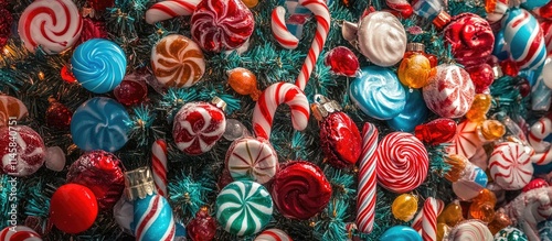 Colorful Christmas candies and ornaments adorning a festive tree creating a cheerful holiday atmosphere