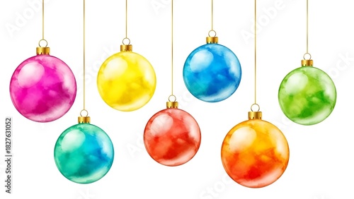 Colorful christmas ornaments hanging on strings isolated on white background