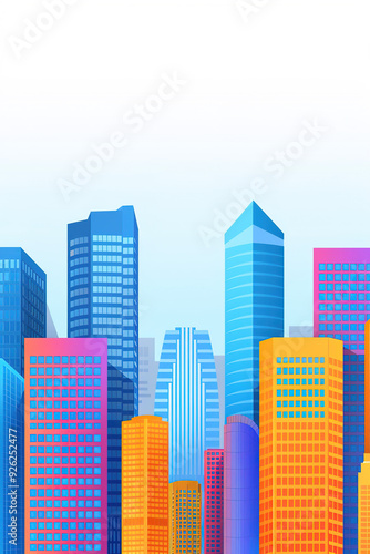 Colorful city skyline illustration with modern skyscrapers reaching for the sky