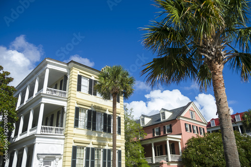 Colorful classical Southern architecture of the Battery neighborhood with palmetto palms in Charleston, South Carolina