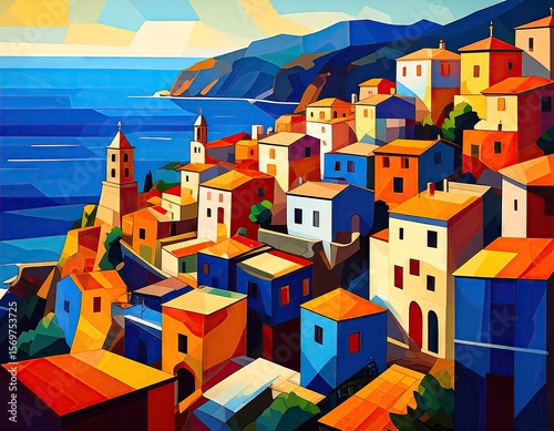 coastal, town, building, house, colourful, ocean, mountain, landscape, high-coloured, geometric, art, view, mediterranean, sunny, sea, horizon, sky, cloud, pastel, terraced, warm, blue, orange, red, yellow, green, perspective, digital, image