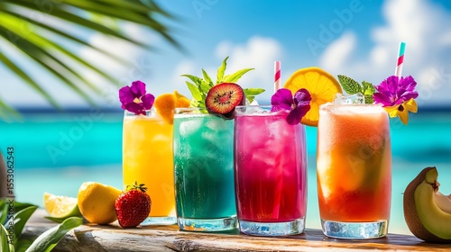 Colorful cocktails by the beach under the sun.