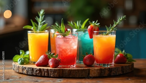 Colorful cocktails served on wooden tray in bar interior. Various drinks with fresh fruit herbs and ice. Refreshing beverages for social gathering. Cocktail mixology concept.
