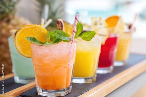 Colorful cocktails standing on a tray, garnished with orange slice and mint leaves