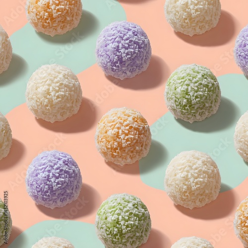 Colorful coconut-covered sweets arranged in a vibrant pattern on a pastel background