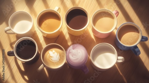 hot drink, cup, cafes, cafes, drink, breakfast, morning, sunlight, table, wooden, latte, espresso, cappuccino, milk, colourful, different, variety, arrangement, beverage, hot, tableware, ceramic, topview, image, photo