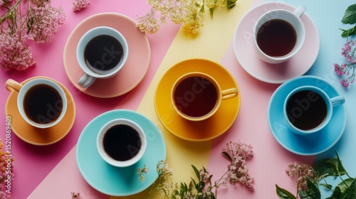 Colorful coffee cups on vibrant floral table setting with overhead flat lay food composition scene