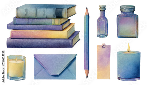 illustration, book, stack, journal, crayons, bottle, jar, tags, candle, candleholder, envelope, stationery, pastel, gradient, shape, texture, art, design, decoration, study, learning, office, workspace, aesthetic, creative, minimal, vintage, modern, color palette, craft, hand-made, supply, visual, detail, unique, simple, bright, cheerful, soft, artistic, semitransparent