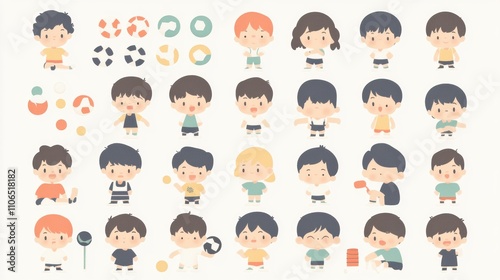 Colorful Collection of Playful Cartoon Boys Engaged in Various Activities, Sporty Poses, Expressions, and Fun Illustrations for Children's Projects and Educational Materials