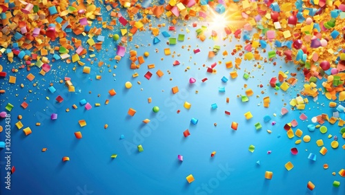 Colorful confetti scattered on a bright blue background with sunny yellow and orange hues , birthday celebration, celebratory mood