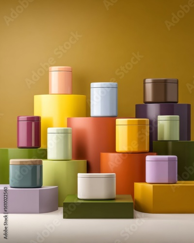 Colorful containers arranged neatly on podiums in minimal product layout.