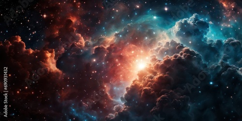 Colorful cosmic nebula veiled in space dust, a celestial spectacle. Fantastic space nebula with glowing cosmic clouds on black background. Universe, stars and galaxies clusters of fantastic worlds
