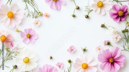 Colorful Cosmos Flower Frame on White Background for Spring and Summer Holiday Cards with Gentle Organic Vibes and Ample Copy Space