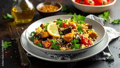 couscous, salad, vegetable, roasted, colourful, healthy, vibrant, mediterranean, dish, plate, food, delicious, alimentary, fresh, light, meal, lunch, dinner, vegetarian, vegan, cookery, tasty, appetising, portion, rustic, organic, ingredient, seasonal, eatery, photo, closeup, still life