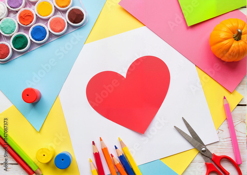 Colorful craft supplies with red heart cutout and pumpkin on creative workspace for DIY projects