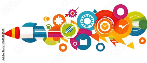 Colorful Creative Elements with Pencils and Geometric Shapes Representing Ideas, Innovation, and Imagination in a Dynamic and Bright Composition
