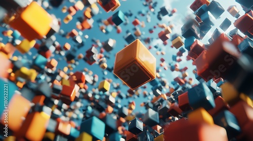 cube, colourful, falling, sky, blue, background, abstract, design, texture, three-dimensional, rendering, pattern, vibrant, block, shape, geometry, digital, art, illustration, graphic, modern, style, bright, colours, orange, red, yellow, green, teal, dark, light, shadow, depth, perspective, motion, dynamic, energy, movement, space, floating, chaotic, random