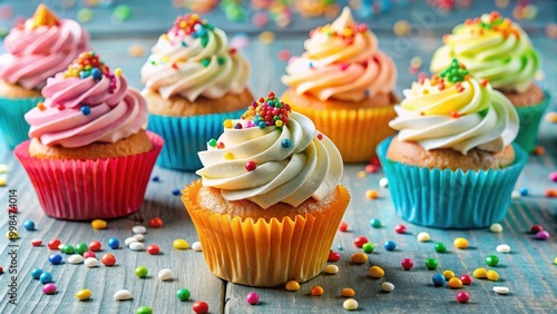 Colorful cupcakes with creamy frosting and sprinkles, perfect for celebrations and parties, cupcakes, colorful, creamy