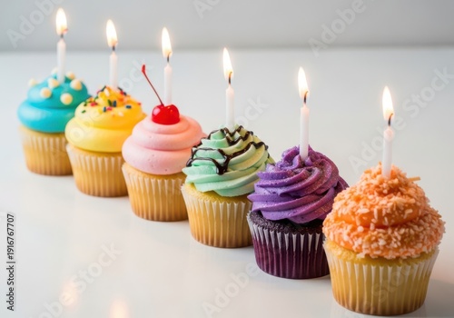 Colorful cupcakes with lit candles arranged in a celebratory line.
