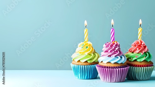 Colorful cupcakes with lit candles on light blue background