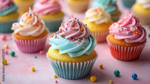 Colorful Cupcakes with Whipped Frosting and Sprinkles on a Table