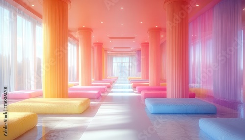 row, hallway, cushion, pillow, seating, bench, row, line, aligned, hall, passage, interior, structure, column, support, post, high-coloured, bright, radiant, drape, transparent, light, airy, architecture, design, indoor, perspective, straight, clean, modern, contemporary, calm, peaceful, relaxing, tranquil, harmony, soothing, abstract, creative, artistic